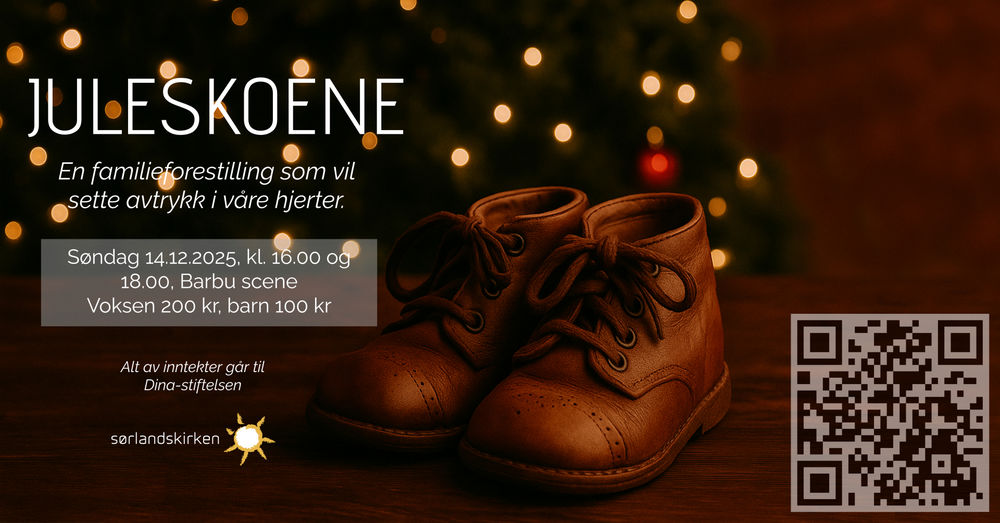 Hjertelig velkommen til familieforestillingen Juleskoene med Sørlandskirkens egne folk. En forestilling for liten og stor. Juleskoenes fortellinger og kjente juletoner vil ta oss med i historien, som skapte en ny tidsregning. Vi håper at det vil skape avtrykk i våre hjerter! Alt av inntekter går til Dina-stiftelsen.